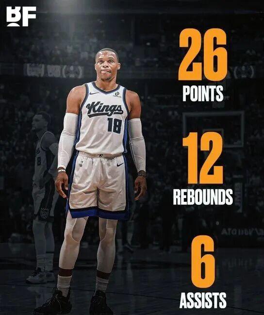 今天威少繼續首發出戰37分鍾,17投10中,3分6中3,全場拿下了26分12板6助2搶斷6失誤。
